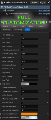 All settings provided are fully customisable, including on and off switches, using the actor that can be dragged straight from the contents into your chosen level. (SEE FULL LIST OF OPTIONS IN THE BOTTOM SCREESHOT).